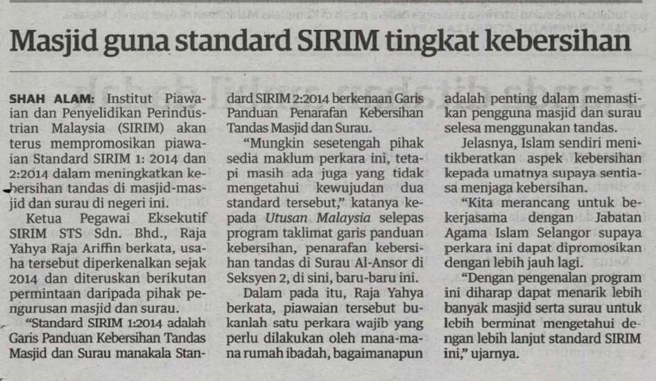 “Standard SIRIM 1:2014 adalah Garis Panduan Kebersihan Tandas Masjid dan Surau manakala Standard SIRIM 2:2014 berkenaan Garis Panduan Penarafan Kebersihan Tandas Masjid dan Surau.